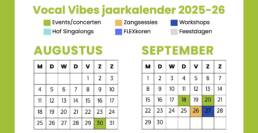 In de Vocal Vibes jaarkalender 2025-26 zie je in één oogopslag wat er dit seizoen allemaal te zingen valt. Iedere maand een FLEXkoor en een Zangsessie, om de maand een HOF Singalong (NIEUW!), om de maand een workshop en tussendoor allerlei special events zoals het Kampvuurcafé (30/8), Top2000-singalong (31/12) en de Castle Christmas concerten (13-21 dec).